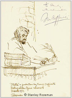 After the dress rehearsal and deeply appreciative of Zeffirelli's enthusiasm, Roseman asked him if he would autograph the drawing. Zeffirelli gladly did so and included a personal inscription: ''To Stanley, with admiration.'' Being that the eminent Italian director, an artist himself, had worked with many of the most celebrated performers in plays and operas by the greatest dramatists and composers, Zeffirelli's esteem for Roseman's draughtsmanship was an auspicious beginning to his work on the performing arts.